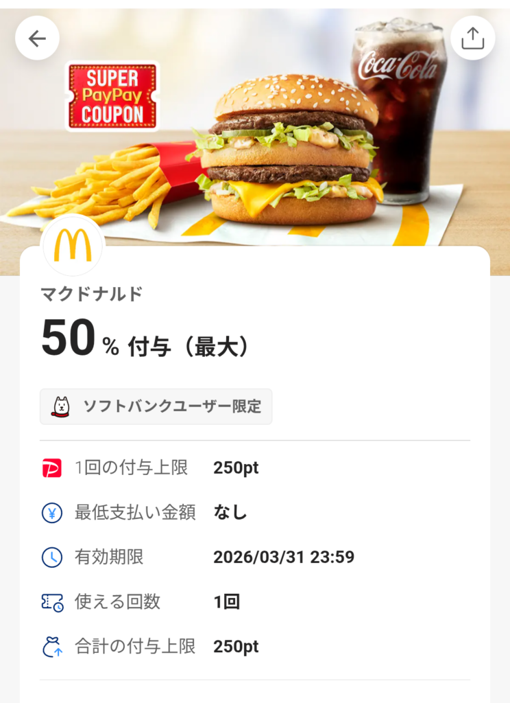 マクドナルドが50%還元?PayPayクーポンが神すぎた【ソフトバンク・ワイモバイル限定】